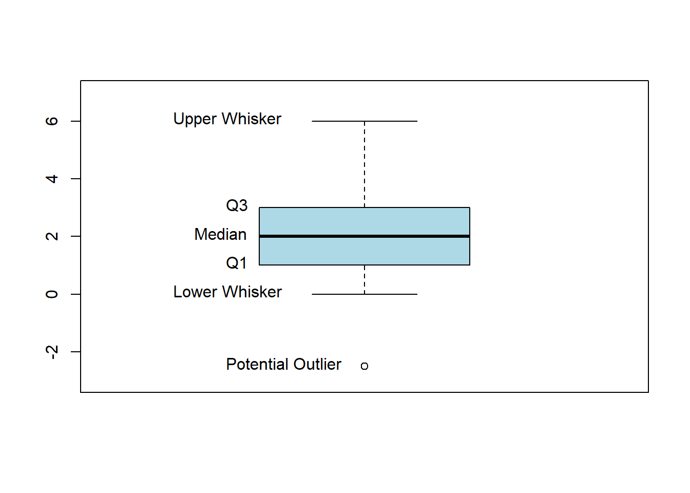 - Draw the whiskers. The whiskers’ upper limit is \(\text{Q3}+1.5\times\text{IQR}\) and the lower limit is \(\text{Q1}-1.5\times\text{IQR}\). The actual whiskers are then drawn at the next closest data points within the limits.