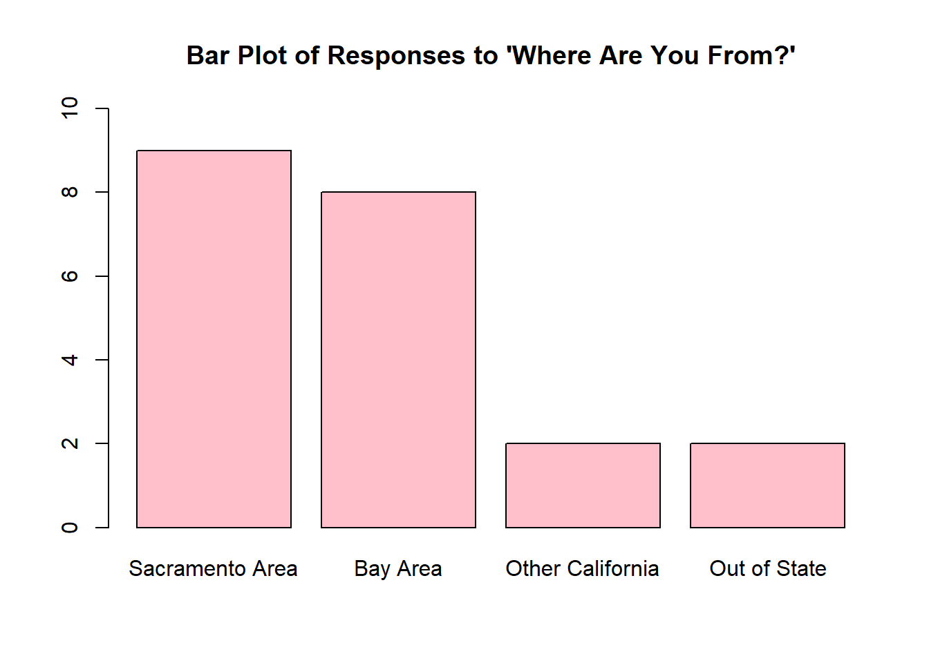 - A class of intro stats students were asked where they were from. A bar chart of their responses is shown below.