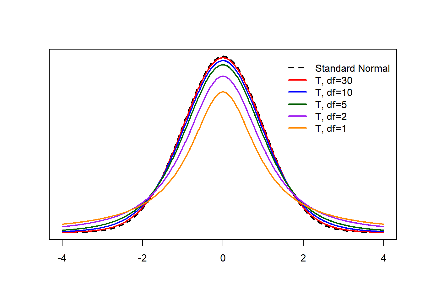 Enter: the t-distribution. If \[Z = \frac{\bar{X}-\mu}{\sigma/\sqrt{n}}\] has a standard normal distribution (for \(X\) normal or \(n\ge30\)), the slightly modified \[T = \frac{\bar{X}-\mu}{s/\sqrt{n}}\] has what we call the t-distribution with \(n-1\) degrees of freedom (even when \(n < 30\)!). The only thing we need to know about degrees of freedom is that \(\text{df}=n-1\) is the t-distribution’s only parameter.