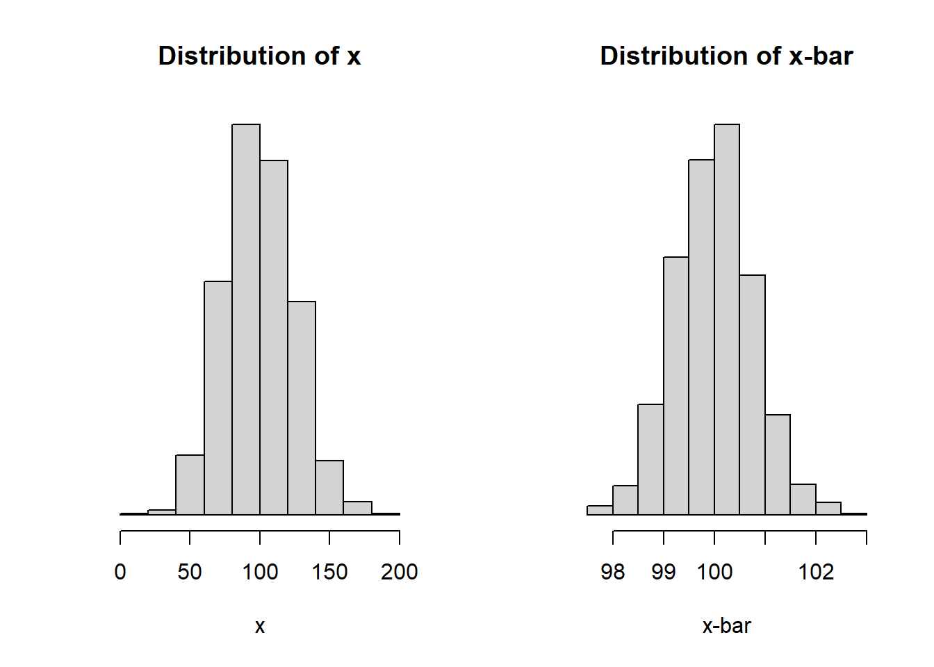 In fact, if \(X\) is Normal(\(\mu\), \(\sigma\)), then \(\bar{X}\) is Normal(\(\mu_{\bar{X}}=\mu\), \(\sigma_{\bar{X}}=\sigma/\sqrt{n}\)).