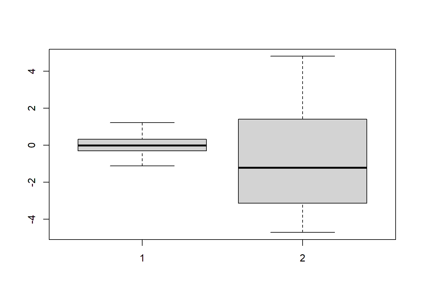 Both samples are size \(n=100\) and have \(\bar{x}=0\), which would be our point estimate for \(\mu\)… but Variable 1 has a standard deviation of \(\sigma=0.5\) and Variable 2 has standard deviation \(\sigma=5\). As a result, we can be more confident in our estimate of the population mean for Variable 1 than for Variable 2.