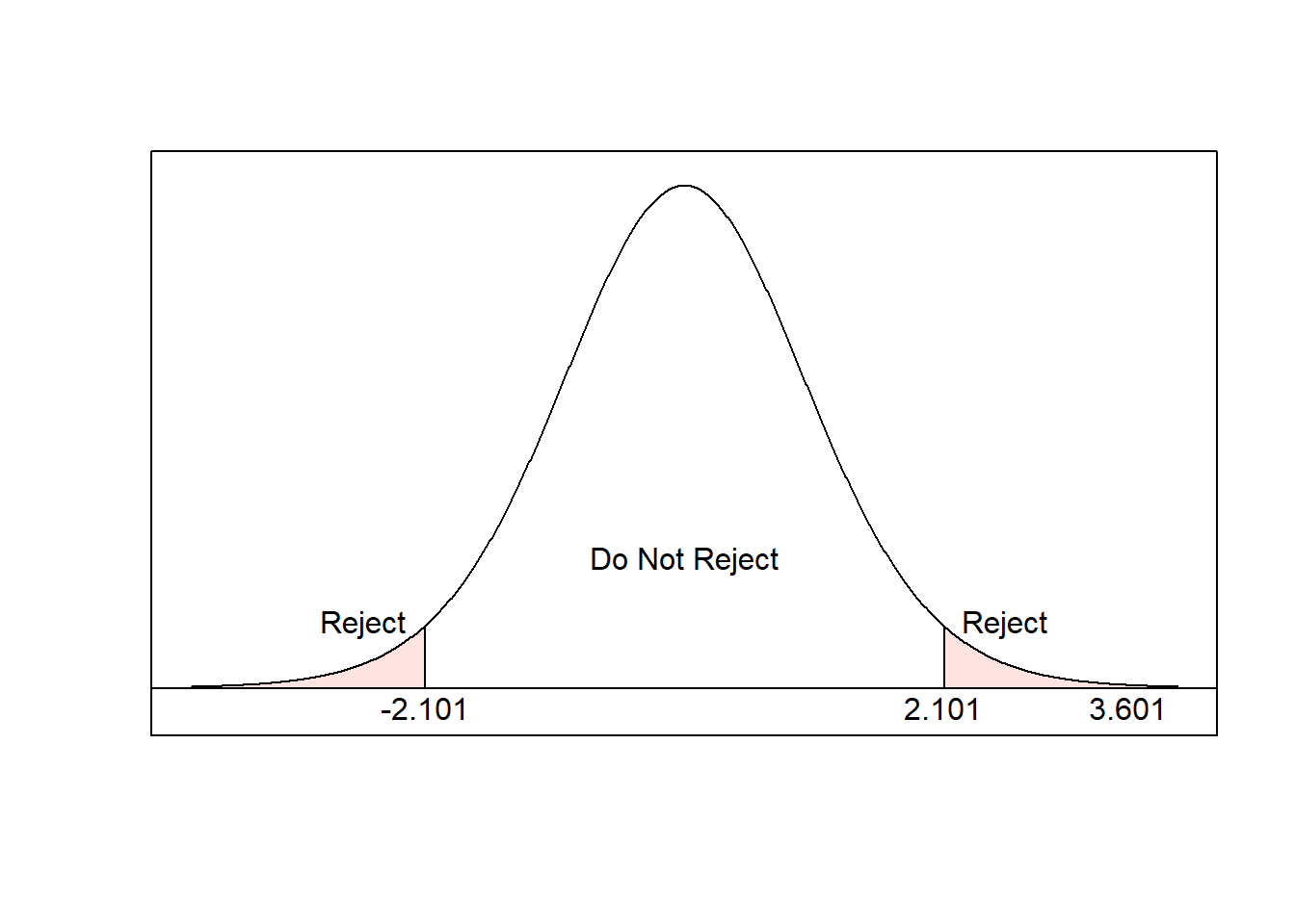 - The test statistic is \[\begin{align} t &= \frac{\bar{x}-\mu_0}{s/\sqrt{n}} \\ &= \frac{4.4-2.5}{2.3/\sqrt{19}} \\ &= 3.601 \end{align}\]