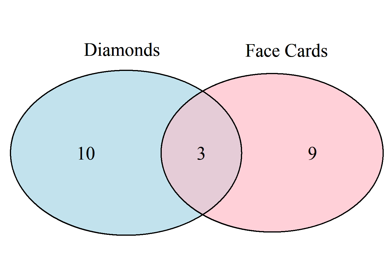 What happened? When I tried to add these, I double counted the Jack of Diamonds, Queen of Diamonds, and King of Diamonds (the cards that are in both \(A\) and \(B\)). To deal with that, I need to subtract off the double count \(\frac{13}{52}+\frac{12}{52}-\frac{3}{52}\).