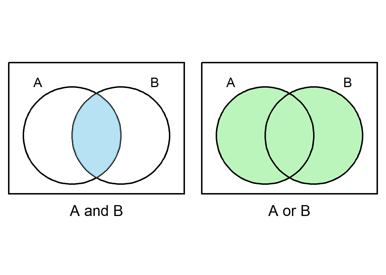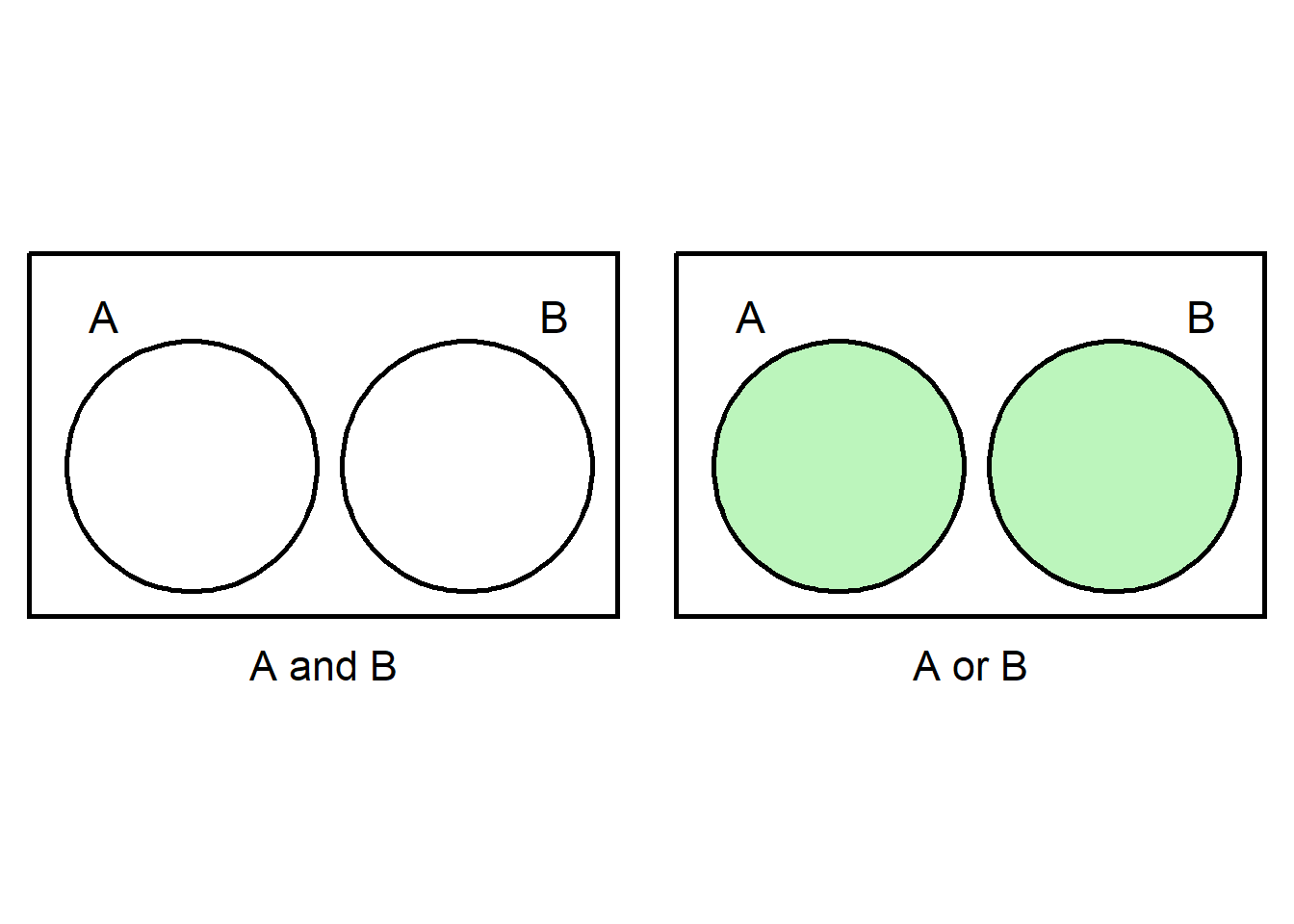 Notice that when we say “or”, we include the situations where A is true, B is true, and the situation where are both A and B are true. This is an inclusive or. Basically, if I said “Do you like cats or dogs?” and you said “Yes.” because you like cats and dogs, that would be a perfectly valid response. I recommend using the inclusive or with your friends any time you want to get out of making a decision.