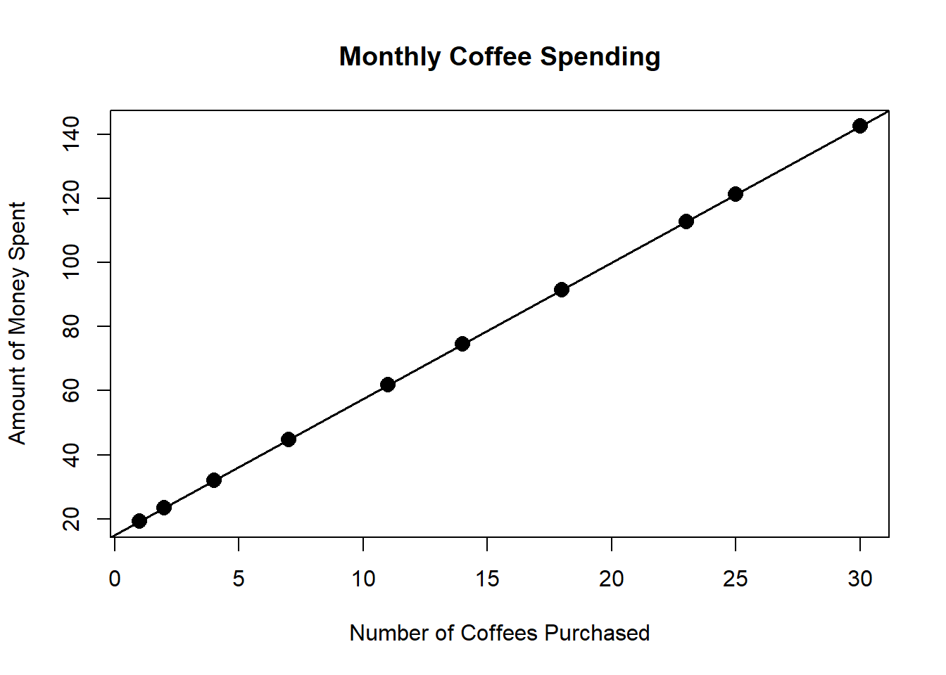 This relationship can be modeled perfectly with a straight line: \(y = 15 + 4.25x\). The y-intercept tells us that, in a month when this person buys zero coffees (\(x=0\)), they spend \(\$15\). The slope tells us that, for each additional coffee purchased, the amount of money spent in that month goes up by \(\$4.25\)