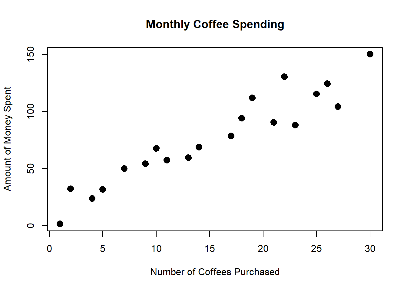Linear regression takes the idea of fitting a line to points and allows the relationship to be imperfect. What if that bag of coffee didn’t always cost $15? Or the coffee drinks didn’t always cost $4.25? In this case, you might get a plot that looks something like this: