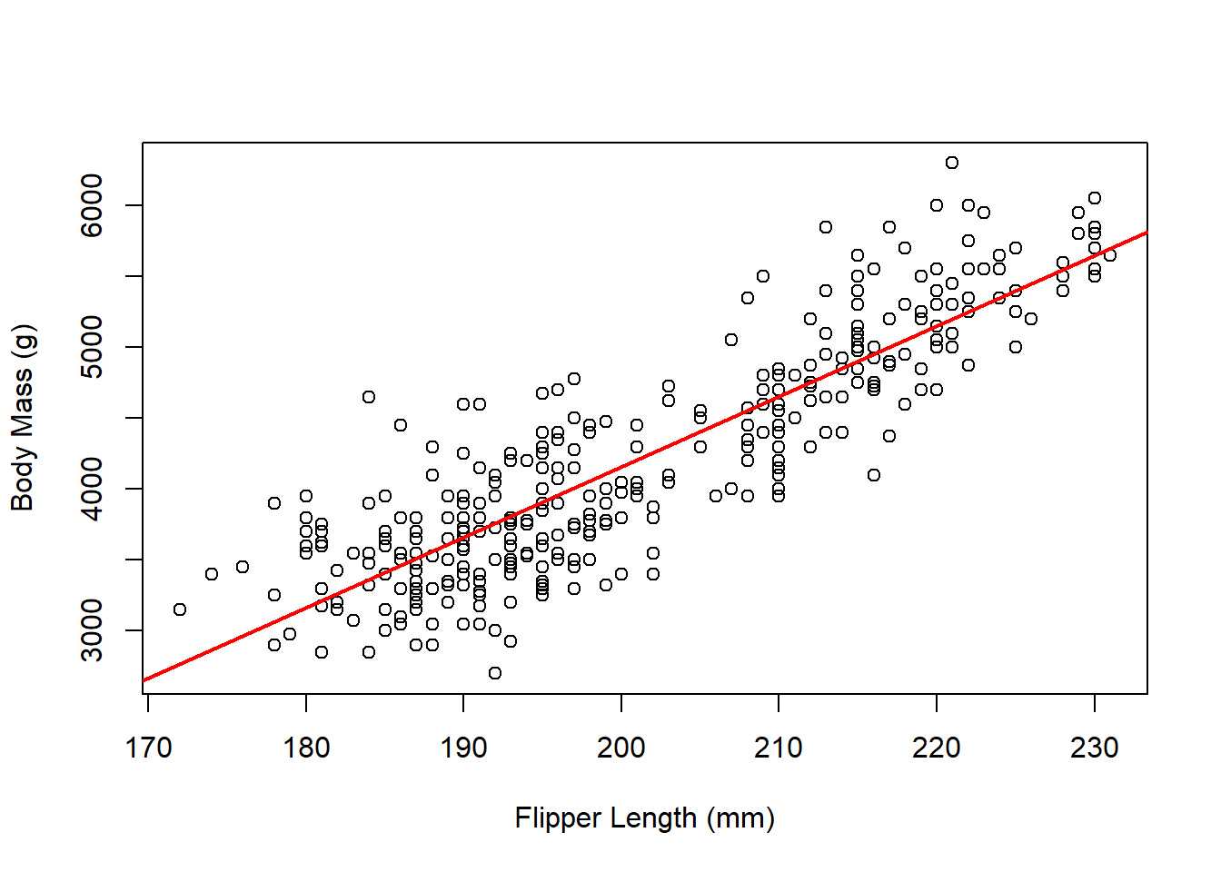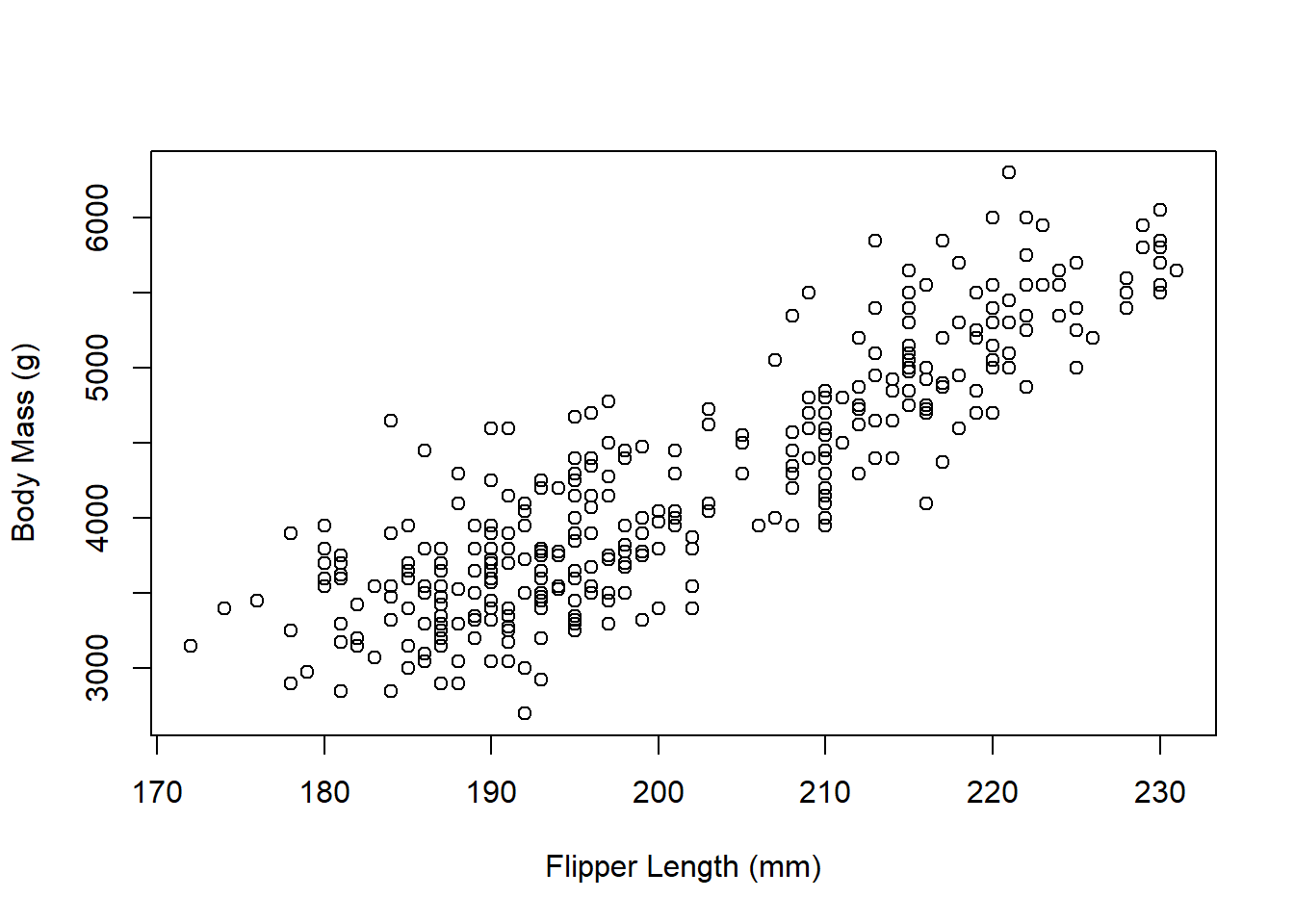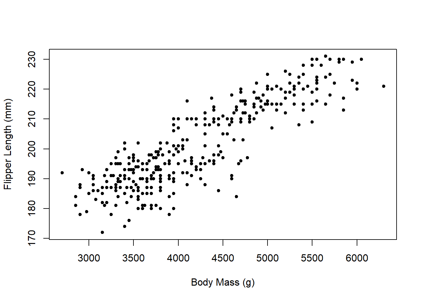 - The penguinsdata set (from thepalmerpenguinspackage in R) has data on various penguin body measurements. We want to consider the relationship between a penguin’sbody massfrom itsflipper length. The scatter plot below shows the relationship between these two variables.