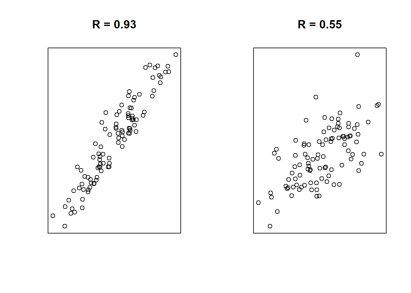 We’ve talked about the strength of linear relationships, but it would be nice to formalize this concept. The correlation between two variables describes the strength of their linear relationship. It always takes values between \(-1\) and \(1\). We denote the correlation (or correlation coefficient) by \(R\): \[R = \frac{1}{n-1}\sum_{i=1}^n\left(\frac{x_i - \bar{x}}{s_x}\times\frac{y_i - \bar{y}}{s_y}\right)\] where \(s_x\) and \(s_y\) are the respective standard deviations for \(x\) and \(y\). The sample size \(n\) is the total number of \((x,y)\) pairs.