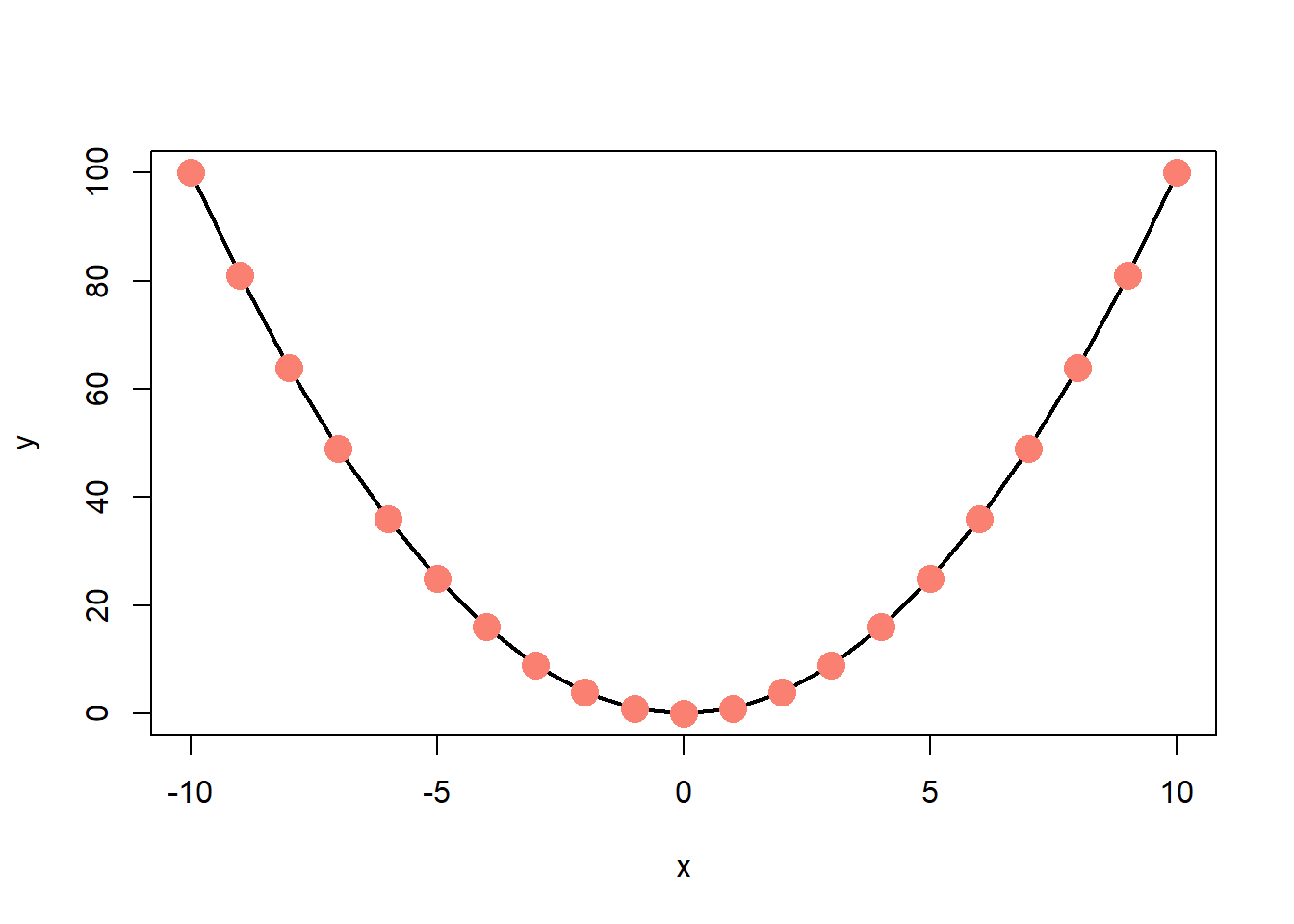Obviously there’s a strong relationship between \(x\) and \(y\). In fact, there’s a perfect relationship here: \(y = x^2\). But the correlation between \(x\) and \(y\) is 0! This is one reason why it’s important to examine the data both through visual and numeric measures.