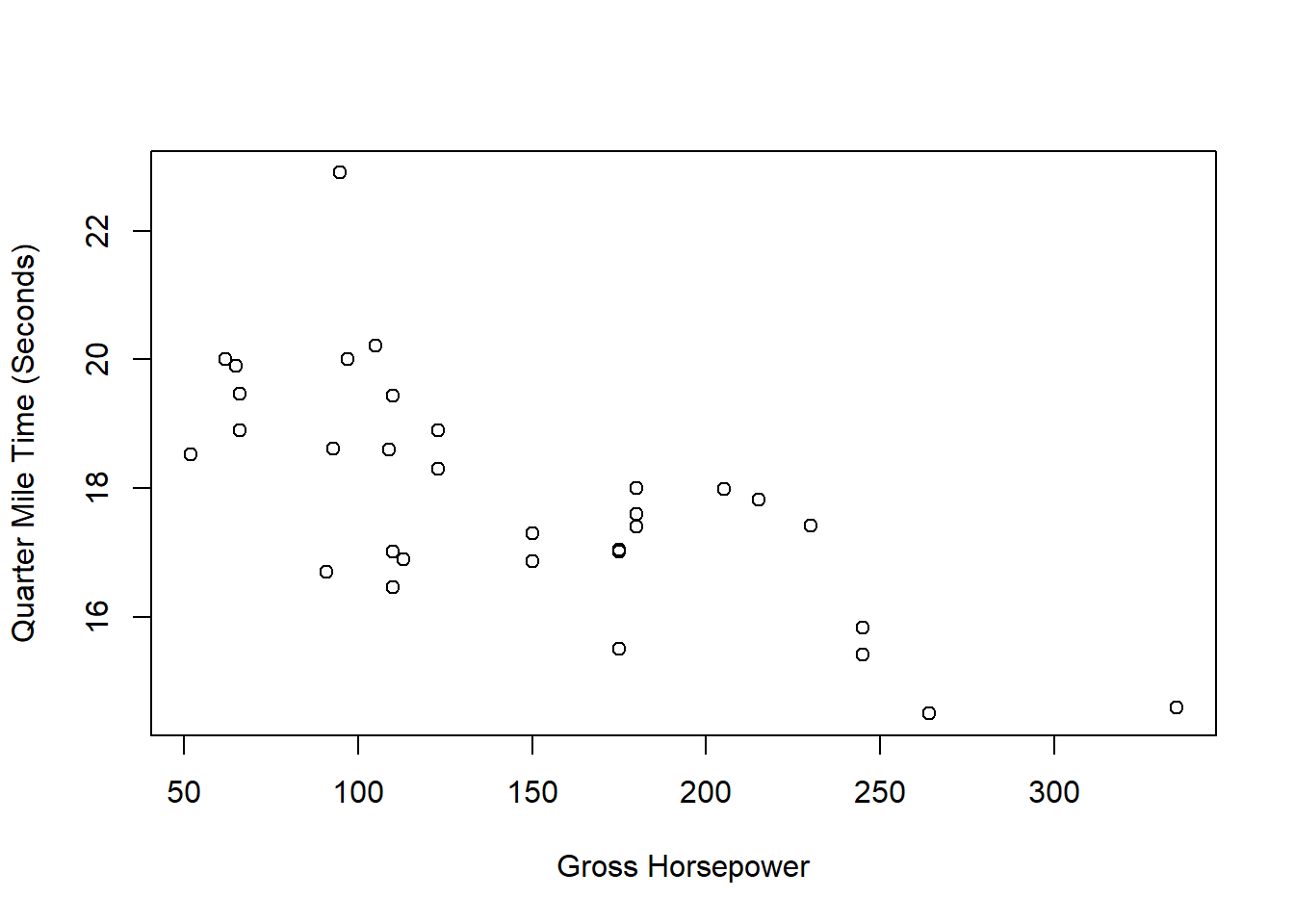 - The mtcarsdataset has measurements (from 1974) on various aspects of automobile design for 32 automobiles. Suppose we want to usehorsepowerto predictquarter mile time. The sample statistics for these data are
